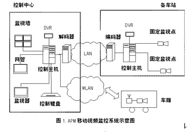 移動視頻監(jiān)視系統(tǒng)主要包括前端設(shè)備、后端設(shè)備和傳輸設(shè)備組成。前端設(shè)備主要指圖像攝取設(shè)備(如各種類型的攝像機(jī)),后端設(shè)備主要指圖像顯示、圖像錄制、系統(tǒng)控制等設(shè)備,前后端需要通過傳輸系統(tǒng)連接。為了支持系統(tǒng)的移動功能,傳輸環(huán)節(jié)中至少有一部分是無線傳輸系統(tǒng)。APM移動視頻監(jiān)控系統(tǒng)的組成如圖1所示。