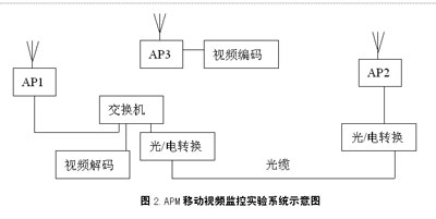 為了保證APM移動視頻監(jiān)控系統(tǒng)的整體性能,筆者就APM系統(tǒng)無線網(wǎng)絡(luò)和視頻編碼器的各自性能,進(jìn)行了實(shí)驗(yàn)。本次實(shí)驗(yàn)采用兩個步驟,即實(shí)驗(yàn)室測試和現(xiàn)場模擬實(shí)驗(yàn)測試,并在實(shí)驗(yàn)室測試的基礎(chǔ)上,對無線網(wǎng)絡(luò)和視頻編碼器間的初步配合進(jìn)行現(xiàn)場實(shí)驗(yàn)測試,F(xiàn)場的實(shí)驗(yàn)系統(tǒng)組成如圖2所示。