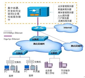 酒店客房以LAN方式接入,客房流量匯聚后上連到城域POP點(diǎn)業(yè)務(wù)路由器或BRAS,房間內(nèi)可采用家用以太網(wǎng)交換機(jī)擴(kuò)展端口以同時(shí)連接PC和STB,并通過(guò)劃分VLAN來(lái)隔離數(shù)據(jù)和視頻業(yè)務(wù),視頻業(yè)務(wù)數(shù)據(jù)經(jīng)過(guò)BRAS后路由到中心業(yè)務(wù)平臺(tái),Internet業(yè)務(wù)數(shù)據(jù)則路由到Internet。