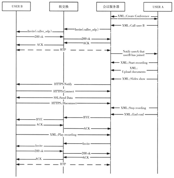 基于上述多媒體會(huì)議業(yè)務(wù)的實(shí)現(xiàn)流程,圖3給出了一個(gè)多媒體會(huì)議業(yè)務(wù)典型應(yīng)用的信令流程,具體包括對于用戶創(chuàng)建會(huì)議、邀請與會(huì)成員、會(huì)議中的,文件演示、會(huì)議的錄制與會(huì)議的回放等信令流程的描述。