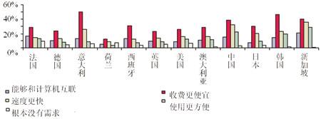 手機上網(wǎng)也受到一些用戶的歡迎,這得益于一些運營商為促進(jìn)移動互聯(lián)網(wǎng)的推廣而越來越多地采取了手機上網(wǎng)打包套餐。此外,不同地區(qū)的用戶對使用手機上網(wǎng)的偏好不同,調(diào)查顯示,亞洲國家用戶使用手機上網(wǎng)的比例高于歐洲國家用戶。其中,日本的被調(diào)查者通過手機上網(wǎng)的比例明顯超過平均水平,這離不開NTTDoCoMo公司i-Mode的成功。有意思的是,中國緊隨日本排名第二,這有可能是因為移動通信在中國的普及率并不高,目前的用戶對技術(shù)的領(lǐng)悟能力大大超過了其它國家的平均水平,也有可能是因為一些被調(diào)查者用手機替代了固定電話,手機成為其上網(wǎng)的惟一途徑(見圖3)。展望未來,Ovum認(rèn)為該領(lǐng)域充滿了期待。