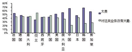 除了每周使用量之外,Ovum還向被調(diào)查者詢問是什么因素阻礙了他們通過手機應(yīng)用上述程序,被提及的最大顧慮是價格昂貴,其次是沒有興趣。在歐洲一些國家,對業(yè)務(wù)不感興趣是和費用昂貴同等重要的原因,在荷蘭,選擇對移動業(yè)務(wù)不感興趣的比例甚至超過了認(rèn)為費用昂貴的比例。此外很有趣的是,沒有一個被調(diào)查者表示因為手機沒有這些功能而導(dǎo)致無法使用業(yè)務(wù)。(見圖4)