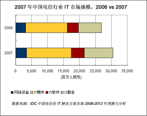 IDC《中國電信行業(yè)IT解決方案市場2008-2012年預(yù)測與分析》報告的數(shù)據(jù)顯示,2007年中國電信行業(yè)整體IT支出規(guī)模為305.02億元人民幣,比2006年增長了13.2%。2007年電信行業(yè)IT運營支撐系統(tǒng)和增值業(yè)務(wù)系統(tǒng)的高速增長主要是由于運營商都在為3G的實施和全業(yè)務(wù)運營做準(zhǔn)備。