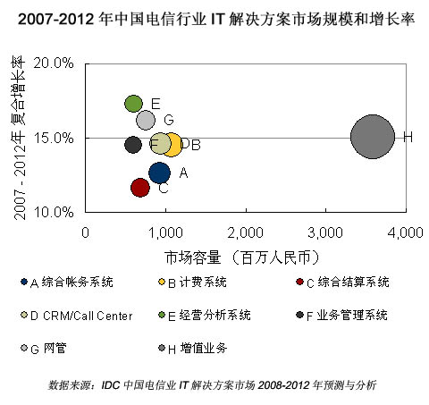 IDC預(yù)計,2007-2012年電信行業(yè)將注重運營支撐系統(tǒng)的全業(yè)務(wù)運營整合和支持前端業(yè)務(wù),因此3G增值業(yè)務(wù)、經(jīng)營分析系統(tǒng)、客戶關(guān)系管理系統(tǒng)、IT服務(wù)管理系統(tǒng)等建設(shè)將實現(xiàn)快速增長。已有項目仍然會持續(xù)升級維護,以及配合全業(yè)務(wù)運營作出功能上的提升。2007年電信IT應(yīng)用解決方案(僅含解決方案供應(yīng)商自有軟件及其相關(guān)服務(wù)包括BSS/OSS/MSS/VAS)市場規(guī)模為97.27億元人民幣,占整體電信軟件和服務(wù)市場容量的74.5%。2012年電信行業(yè)IT解決方案整體市場規(guī)模將達到193.5億元人民幣。