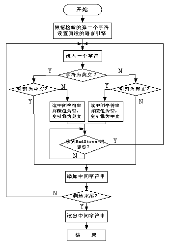Sam,這樣就實(shí)現(xiàn)了中英文混合文本的朗讀。具體的解決方案是:依序處理文本中每個(gè)字符,判斷字符中含有的中英文類(lèi)型,若類(lèi)型與前一字符相同則添加至中間變量,否則朗讀中間變量文本并保存當(dāng)前位置,接著切換引擎。文本朗讀結(jié)束,發(fā)出EndStream消息,從當(dāng)前位置繼續(xù)循環(huán)。其流程圖如圖4所示。