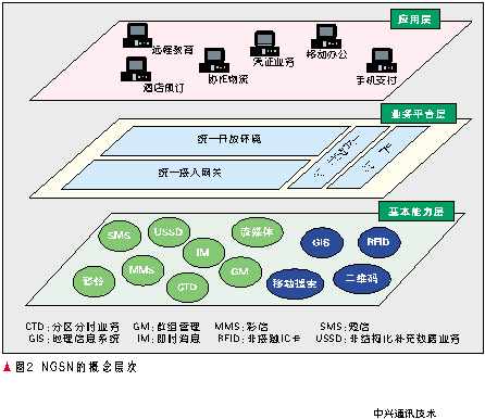 NGSN是為了適應(yīng)網(wǎng)絡(luò)和技術(shù)的融合趨勢、運(yùn)營商轉(zhuǎn)型的需求提出的,通過整合各種網(wǎng)絡(luò)業(yè)務(wù)能力,實(shí)現(xiàn)數(shù)據(jù)、業(yè)務(wù)、能力和管理的統(tǒng)一,從而能夠快速提供各種增值業(yè)務(wù)、協(xié)助運(yùn)營商在價(jià)值鏈中處于主導(dǎo)地位。其概念層次如圖2所示。
