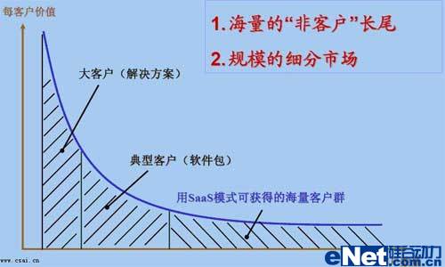 SaaS模式就是不論是什么樣的客戶都向其提供服務(wù),不論服務(wù)的時(shí)間長(zhǎng)短,不論身處何地。傳統(tǒng)軟件是很難適應(yīng)普通客戶的,普通客戶付不出更多的投資,也不想軟件、硬件、服務(wù)都全面去投資,這樣就只有放棄使用軟件了。自然,軟件市場(chǎng)就少了一大群消費(fèi)者。而SaaS模式將不細(xì)分客戶類型,讓人人都可使用軟件,讓個(gè)個(gè)都消費(fèi)得起軟件?上攵,這是一個(gè)怎么龐大的市場(chǎng)。如下圖所示: