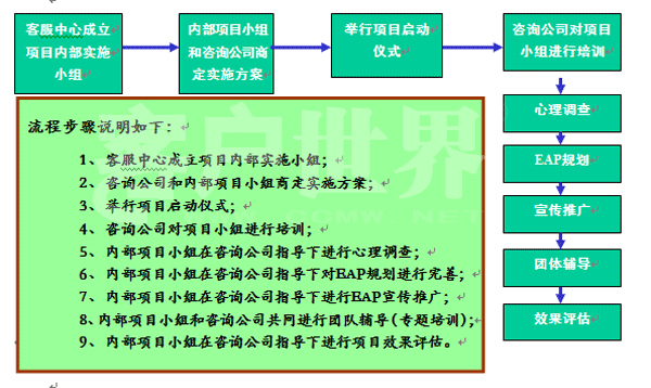 2007年11月,中國移動江蘇公司客戶服務中心EAP計劃正式啟動,這是中心為全體員工獻上的一份特別的“精神福利”。 EAP(Employee Assistance Program),中文被譯為“員工幫助計劃”,是由組織為其成員設置的一項長期的、系統(tǒng)的援助和福利計劃。它源于20世紀40年代的美國,目前美國中型和大型企業(yè)的EAP普及率為60―70%,英國有將近113個組織提供EAP服務、2200萬員工享受EAP服務,而在我國近年來也有許多企業(yè)開始運用EAP服務,中國陸續(xù)召開了三屆EAP年會,越來越多的企業(yè)開始關注員工的心理健康。