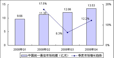 賽迪顧問預測,2008年全年中國統(tǒng)一通信市場都將保持快速的增長勢頭,雖然第三季度增長趨勢有所放緩,全球金融海嘯的反作用將進一步提高企業(yè)對統(tǒng)一通信產品的認知,促進中國統(tǒng)一通信市場的發(fā)展,第四季度市場將出現反彈趨勢,增長速度超過12%,市場規(guī)模13.53億元,2008年全年中國統(tǒng)一通信市場規(guī)模將達到46.6億元,同比增長超過50%。