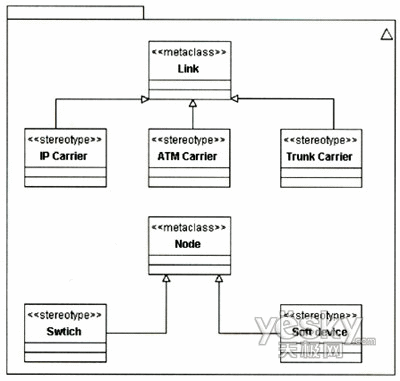 該擴展針對Link和Node和兩個元類增加了NGN中關于承載和節(jié)點的定型。可以根據(jù)需要對該模型作進一步擴展,如可以增加關于接入網(wǎng)承載的定型等。