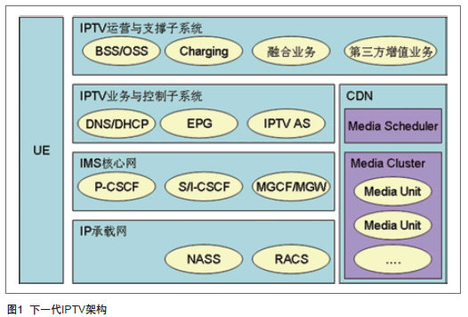 下一代IPTV架構(gòu)按功能屬性總體上劃分為UE、IPTV運(yùn)營(yíng)與支撐子系統(tǒng)、IPTV業(yè)務(wù)與控制子系統(tǒng)、CDN內(nèi)容分發(fā)網(wǎng)絡(luò)、IMS核心網(wǎng)和IP承載網(wǎng)五個(gè)子系統(tǒng),如圖1。