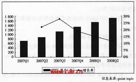 Play業(yè)務(wù),AT&T、Verizon等電信運營商也積極開展IPTV業(yè)務(wù),并且用戶規(guī)模迅速增長,截至2008年第二季度,美國的IPTV用戶達到249萬。亞太各個國家和地區(qū)的IPTV業(yè)務(wù)發(fā)展情況差異很大,中國香港的PCCW是目前IPTV用戶規(guī)模最大的電信運營商,截至2008年第二季度,PCCW的IPTV業(yè)務(wù)“now