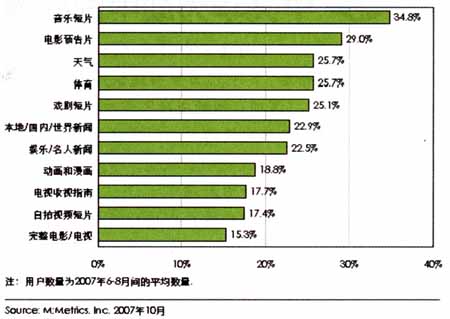 M:Metrics針對美國手機(jī)用戶的研究數(shù)據(jù)顯示,美國手機(jī)用戶在訂閱手機(jī)電視內(nèi)容時(shí)偏愛娛樂類的內(nèi)容,其中音樂短片、電影預(yù)告片是用戶需求最大的手機(jī)電視內(nèi)容,另外受到歡迎的是與生活相關(guān)的內(nèi)容及新聞內(nèi)容。