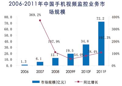 根據諾達咨詢《手機視頻監(jiān)控市場及用戶行為研究報告2009》研究結果,2006-2009年為手機監(jiān)控業(yè)務導入期,2006年手機監(jiān)控業(yè)務市場規(guī)模達到1.3億人民幣,手機監(jiān)控業(yè)務的年運營費用自2009年開始,將會逐步下降,目前平均約1000元/年,至2011年將逐步下降到600元/年,設備費用也將由目前的3000元/點,逐步下降到2011年的1000元/點。