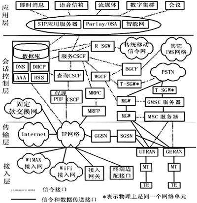 應(yīng)用層包括SIP應(yīng)用服務(wù)器、Parlay/OSA和智能網(wǎng)。Parlay/OSA提供的標(biāo)準(zhǔn)應(yīng)用編程接口(API),提供了一個開放的業(yè)務(wù)平臺,有利于第三方的業(yè)務(wù)提供。具體的業(yè)務(wù),如語音、視頻、即時消息、數(shù)字集群等都可以融合在統(tǒng)一的平臺上。