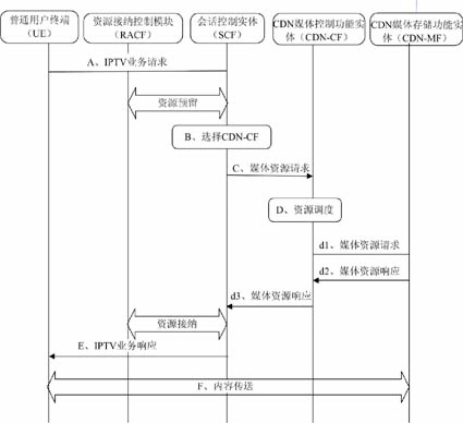 - 會話控制實體收到IPTV業(yè)務(wù)請求后,根據(jù)用戶所在的地理位置、用戶類型等信息選擇為該用戶服務(wù)的CDN-CF,并向CDN-CF發(fā)送媒體資源請求。