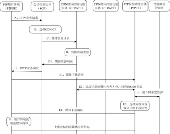 本架構(gòu)的最大特點(diǎn)是結(jié)合CDN和NGN架構(gòu)(注:為了簡化沒有給出詳細(xì)的NGN相關(guān)控制實體,架構(gòu)中只體現(xiàn)了會話控制實體和資源接納控制功能實體),在此基礎(chǔ)上引入P2P相關(guān)功能,包括P2P控制實體和P2P用戶終端。通過對基于NGN的IPTV架構(gòu)和CDN架構(gòu)的改進(jìn),使該架構(gòu)既能夠具備電信網(wǎng)中網(wǎng)絡(luò)資源可控、可管的特征,又通過引入P2P具備了一定的靈活性和自組織能力,將電信網(wǎng)和互聯(lián)網(wǎng)技術(shù)的優(yōu)勢均集中在了一起。