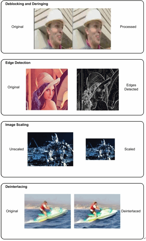 圖: 四種后處理算法示例:解塊和去振鈴、邊界檢測、圖像縮放和解交織。