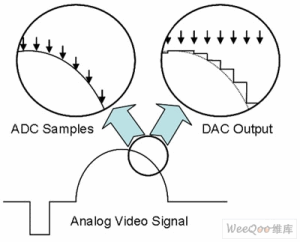 由攝像機(jī)或其他設(shè)備捕獲的模擬視頻信號通過模/數(shù)轉(zhuǎn)換器(ADC)進(jìn)行數(shù)字化處理,它在每個時鐘邊沿即時記錄數(shù)據(jù)(圖2)。模擬信號連續(xù)變化,而轉(zhuǎn)換成數(shù)字信號時則是定時采樣。經(jīng)過數(shù)字處理和傳輸后,數(shù)字信號通過數(shù)/模轉(zhuǎn)換器(DAC)轉(zhuǎn)變成模擬信號。DAC的輸出如圖2的右上角所示,箭頭代表時鐘信號。