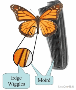 為了反映鏡像邊帶沒有衰減的效果,圖3b和3c示意了奈奎斯特頻率和時鐘頻率處的頻譜重疊。這些疊加的鏡像邊帶信號(圖3d)與視頻信號相比具有隨機(jī)的相位差。圖4表示我們需要避免的圖像誤差!斑吘墧[動”是高頻邊緣干擾,它重疊在視頻信號上,具有隨機(jī)變化的相位。摩爾效應(yīng)是時鐘、視頻信號頻率之間相互作用的結(jié)果。