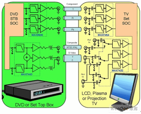 圖6左側(cè)是機(jī)頂盒或DVD機(jī)的框圖,片上系統(tǒng)(SOC)包含了DAC,輸出經(jīng)過低通濾波器(例如MAX7443)進(jìn)行視頻重建。濾波器芯片還包含75Ω同軸電纜驅(qū)動器,驅(qū)動信號在電纜上的傳輸。圖6右側(cè)用于信號接收,信號在經(jīng)過抗混疊濾波器后送入電視機(jī)SOC的ADC。
