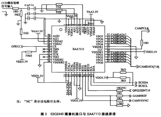 4:2:2格式。對SAA7113初始化需要通過I2C 總線進行,而S3C2440內(nèi)部集成的I2C控制器正好可以實現(xiàn)這個過程。S3C2440的攝像機接口與SAA7113的連接原理如圖3所示。