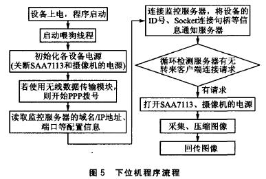 下位機軟件通過驅(qū)動程序提供的接口,在遠程圖像監(jiān)控設(shè)備中完成硬件的初始化、控制等功能,同時又負責圖像的壓縮和傳輸。它是所有設(shè)備的控制中樞,因此這里著重描述下位機軟件的工作流程,如圖5所示。
