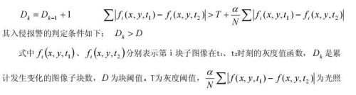 敏感項,α為抑制系數(shù),N為檢測區(qū)域內的像素數(shù)目。采用這種塊比較法,閾值取值范圍大大減小,易于確定,而且對運動目標的大小也有一定的選擇性。在檢測每一子塊圖像是否發(fā)生變化時,引入光照敏感項,避免了因光照變化引起的虛警。這種方法對光線變化有一定的自適應性,擴展了系統(tǒng)的動態(tài)適用范圍。