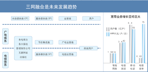 蘇少林:三網(wǎng)融合的推進對于我國在“后危機時代”拉動國內(nèi)消費、形成新的經(jīng)濟增長點有著積極的意義。據(jù)測算,三網(wǎng)融合可帶動6000億元~7000億元的投資和消費,還可增加20萬個就業(yè)崗位,由此推動的固網(wǎng)寬帶業(yè)務(wù)將拉動GDP增長0.8個百分點。因此,電信監(jiān)管部門要站在大力推動信息產(chǎn)業(yè)和文化產(chǎn)業(yè)發(fā)展、提高國民經(jīng)濟和社會信息化水平、滿足人民群眾日益多樣的生產(chǎn)和生活服務(wù)需求的高度上來推進三網(wǎng)融合。