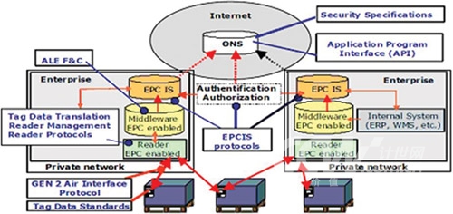 EPCglobal提出了Auto-ID系統(tǒng)的五大技術(shù)組成,分別是EPC(電子產(chǎn)品碼)標(biāo)簽、RFID標(biāo)簽閱讀器、ALE中間件實(shí)現(xiàn)信息的過濾和采集、EPCIS信息服務(wù)系統(tǒng),以及信息發(fā)現(xiàn)服務(wù)(包括ONS和PML)。由于從一開始就讓世界各大洲的從業(yè)人員充分參與,EPCGlobal標(biāo)準(zhǔn)(架構(gòu)圖如下)得到了較廣泛認(rèn)同,這里不再對(duì)其標(biāo)準(zhǔn)體系架構(gòu)贅述。
