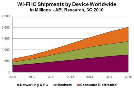 Wi-Fi技術現(xiàn)已被用于幾乎所有筆記本和上網本、智能電話和游戲設備。電話、音頻播放器、打印機、機頂盒以及其他消費類電子設備對Wi-Fi技術的采用率也在不斷增加,來自Wi-Fi聯(lián)盟和多家調研機構的數據印證了這種市場增長趨勢。2009年,僅在中國銷售的具備Wi-Fi功能的筆記本電腦就達到800萬臺,全球Wi-Fi設備認證數量則增加了約50%,消費類電子設備和電話數量增加了100%以上。截止到2010年7月,消費類電子設施與電話類產品的認證數量已經超過了2009年全年數量,預計全年售出約8億臺Wi-Fi設備。