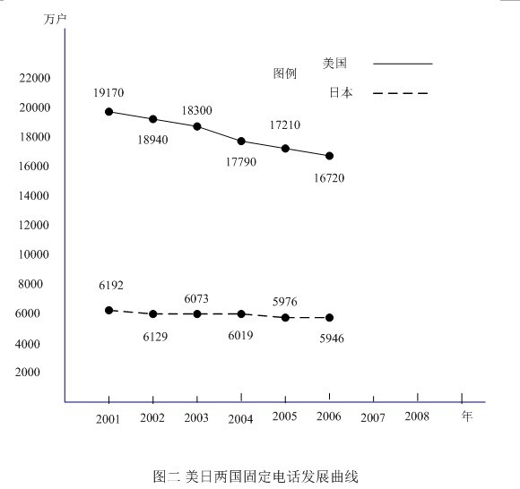 〔3〕大約有2%的美國(guó)家庭沒有電話。IBB咨詢公司資深分析師表示,「美國(guó)擁有大量愛講電話的人,可以隨處打電話正是美國(guó)人熱衷的事情! 大型傳統(tǒng)電話公司如AT&T、威瑞森(Verizon),受到美國(guó)人的這一偏好的影響,移動(dòng)通信業(yè)務(wù)現(xiàn)都已經(jīng)超過了他們?cè)镜暮诵臉I(yè)務(wù)(固定電話)。據(jù)桑福.伯恩斯坦公司的調(diào)查顯示,紐約地區(qū)固定電話的數(shù)量,從2000年以來已經(jīng)下降了55%,新澤西的情況也差不多,下降了50%。德州下降了20%,加州下降了21%。在年輕用戶中這個(gè)趨勢(shì)更為明顯:34.5%的25到29歲年齡段者,家中只有移動(dòng)電話,30到44歲年齡段者,這個(gè)比例下降至15.5%,65歲以上者,只有2.2%。雖然移動(dòng)電話對(duì)固定電話的取代作用,日美兩國(guó)基本相似,但在日本通信公司卻是IP電話和VoIP電話的主要提供者,因此日本固定電話歷年下降曲線就比較平坦,不像美國(guó)那樣厲害,請(qǐng)見圖二。