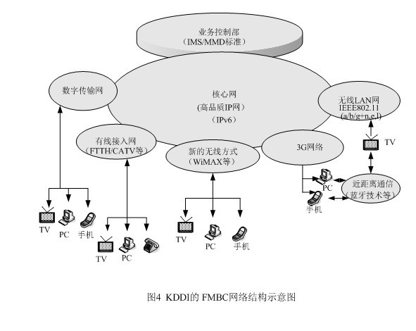 為了在市場(chǎng)競(jìng)爭(zhēng)中立于不敗之地,KDDI另辟稀徑,提出了將固定網(wǎng)、移動(dòng)網(wǎng)、因特網(wǎng)和電視廣播相融合的概念,它與朝日新聞、朝日電視簽署合作框架,就是它的集中代表。FMBC是超3G的構(gòu)想,是以移動(dòng)通信為基礎(chǔ),與固定電話網(wǎng)及因特網(wǎng)進(jìn)行融合,現(xiàn)在又把廣播電視納入,這樣它就成了KDDI的NGN了。FMBC的網(wǎng)絡(luò)結(jié)構(gòu)請(qǐng)見圖4。從圖4上不難發(fā)現(xiàn)NGN的影子,特別是業(yè)務(wù)控制部的設(shè)立,并采用ISM/MMD標(biāo)準(zhǔn),將網(wǎng)絡(luò)與應(yīng)用分開,以利新業(yè)務(wù)的開拓,同時(shí)完成核心網(wǎng)的IP化,這些都是NGN的基本概念。