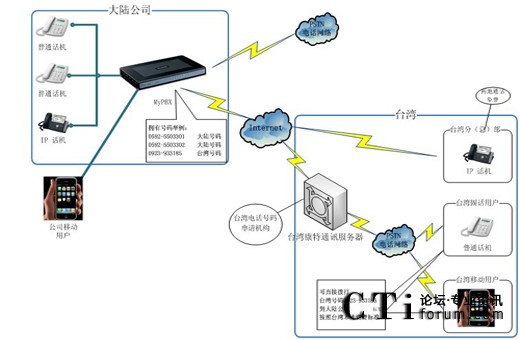 “兩岸通”采用睿威的IPPBX電話系統(tǒng)解決方案搭配灣康特國際IPNet IP線路或者臺灣遠(yuǎn)傳電信的070IP線路, 實現(xiàn)大陸臺企與臺灣電信接軌; 撥打臺灣電話費率比照臺灣節(jié)費費率,同時每臺MyPBX配有專屬臺灣電話門號,呼出臺灣電話顯示070或0923專屬門號,臺灣客戶親友回?fù)?70或0923號碼,立即進(jìn)入MyPBX,并顯示對方來電號碼。
