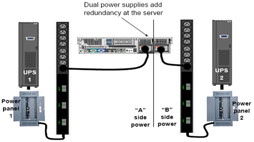 2(N)架構(gòu)與含有雙電源的服務器配合使用。在這種排列中,每個電源一般都是利用一個獨立的供電路徑。那樣,即使整個動力總成都關機進行維修或維護,服務器仍然可用。