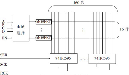 本系統(tǒng)采用行掃描方式,行選通電路由集成電路74HC154構(gòu)成。74HC154是4線-16線高性能譯碼器,在點(diǎn)陣屏幕不大的情況下,一般的單片機(jī)可以直接驅(qū)動(dòng)點(diǎn)陣LED的亮滅,但是考慮擴(kuò)展為大屏幕尺寸時(shí),因單片機(jī)的I/O口不足以提供足夠的驅(qū)動(dòng)電流,但可在74HC154和點(diǎn)陣的行接口接上一個(gè)PNP型8550三極管開關(guān)電路用來(lái)提供足夠的電流,當(dāng)74HC154發(fā)出低電平時(shí),三極管Q導(dǎo)通,輸出高電平。此外,可用帶有2級(jí)鎖存移位輸出功能的74HC595鎖存器來(lái)對(duì)列線進(jìn)行驅(qū)動(dòng)控制。LED點(diǎn)陣的列線接到74HC595的8bit并行輸出口上,由單片機(jī)控制數(shù)據(jù)的輸出,利用74HC595的鎖存輸出功能,電路共用同一個(gè)移位時(shí)鐘SCK和數(shù)據(jù)鎖存時(shí)鐘RCK,可級(jí)聯(lián)多片74HC595以構(gòu)成更大LED點(diǎn)陣屏的列驅(qū)動(dòng)電路。此結(jié)構(gòu)還可在75HC595的使能端通過PWM波進(jìn)行灰度調(diào)節(jié)。以一個(gè)16行×160列的LED點(diǎn)陣單元為例,本系統(tǒng)采用的驅(qū)動(dòng)電路原理如圖所示。