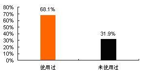 調(diào)查數(shù)據(jù)顯示,在所訪問6個城市的手機用戶中,已使用過數(shù)據(jù)增值業(yè)務(包括已使用過短信業(yè)務或已使用過其它業(yè)務的)的用戶占總體的68.1%,而還未使用過數(shù)據(jù)增值業(yè)務的占總體的31.9%。如下圖所示: