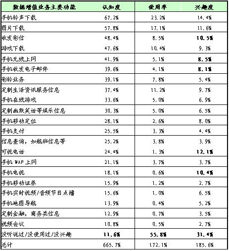 認知度:手機鈴聲下載、圖片下載、收發(fā)彩信、游戲下載、手機無線上網(wǎng)、手機收發(fā)電子郵件、彩鈴業(yè)務、定制生活資訊服務信息(新聞、天氣預報等)等