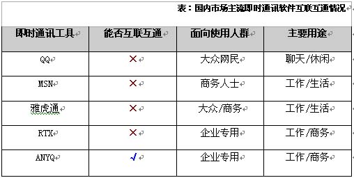 他認(rèn)為,企業(yè)使用即使通訊的溝通是價(jià)值的溝通,企業(yè)內(nèi)外部的溝通過(guò)程中,不能互聯(lián)互通的溝通障礙將在很大程度上影響企業(yè)內(nèi)外部的信息交流甚至業(yè)務(wù)往來(lái)。他提醒筆者關(guān)注一款叫做ANYQ的系統(tǒng),他說(shuō),這是他研究以來(lái)發(fā)現(xiàn)最有潛力的一款已經(jīng)具備互聯(lián)互通配置的企業(yè)即時(shí)通訊軟件。