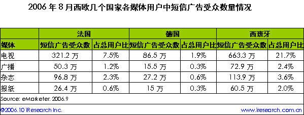 iResearch艾瑞市場(chǎng)咨詢根據(jù)eMarketer資料整理顯示,短信廣告在西歐國(guó)家大行其道,成百上千萬的移動(dòng)用戶訂閱了廣告短信。西歐各國(guó)不同媒體訂閱廣告短信的用戶數(shù)不盡相同?傮w上來看,西班牙的短信廣告受眾最多,電視用戶中有21.7%人訂閱了短信廣告,數(shù)量達(dá)663.3萬。相比之下,法國(guó)電視用戶中的短信廣告受眾只有西班牙的1/2,德國(guó)則更少。