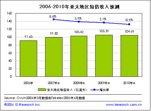 iResearch艾瑞市場(chǎng)咨詢(xún)根據(jù)咨詢(xún)公司Ovum和網(wǎng)絡(luò)應(yīng)用公司Tekelec在2006年的數(shù)據(jù)整理發(fā)現(xiàn),到2010年亞太地區(qū)的短信收入有望達(dá)到104.69億美元,2006年亞太地區(qū)的短信收入在91.63億美元。