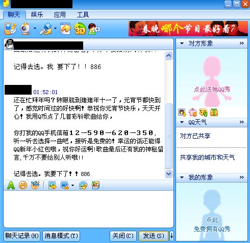 3月4日北京報(bào)道 如果你收到QQ好友發(fā)過來的撥打12590點(diǎn)播元宵節(jié)祝福的信息,千萬不要信以為真,這僅是一些不良SP廠商斂財(cái)?shù)囊环N手段。