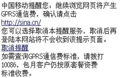 從2007年5月17日起,通過(guò)手機(jī)訪問(wèn)WAP網(wǎng)站,中國(guó)移動(dòng)向用戶主動(dòng)提供一個(gè)收費(fèi)提示頁(yè)面,提醒用戶“正在使用手機(jī)上網(wǎng)業(yè)務(wù),若繼續(xù)瀏覽網(wǎng)頁(yè),將會(huì)產(chǎn)生GPRS通信費(fèi)”。但打開(kāi)中國(guó)移動(dòng)夢(mèng)網(wǎng)頁(yè)面,則不會(huì)有上述提示。
