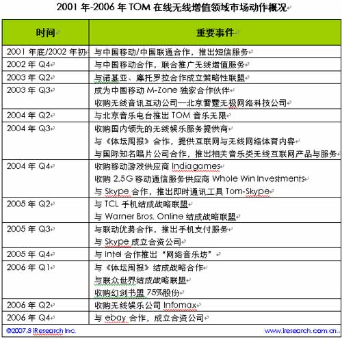2000年中,TOM在線正式推出,這家一開始便以無線增值為特色的企業(yè)符合了當(dāng)時中國互聯(lián)網(wǎng)市場的環(huán)境,那時無線增值業(yè)務(wù)如火如荼,第五媒體的概念呼之欲出。隨后,便開始了與各大無線媒體、傳統(tǒng)媒體等一系列的合作和收購,所涉及的領(lǐng)域涵蓋短信、無線音樂、手機(jī)游戲、手機(jī)支付、手機(jī)體育新聞、即時通訊等許多行業(yè),一個龐大的無線媒體帝國看似已經(jīng)牢不可破。直到,2006年第四季度與ebay易趣合并,開始涉足電子商務(wù)。