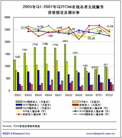隨后,各無線服務(wù)收入則基本處于下滑趨勢,在2007年第二季度,除短信服務(wù)收入達(dá)到991萬美元,較上一季度增長13.9%之外,MMS收入僅246萬美元,環(huán)比減少23.1%,WAP服務(wù)收入為471萬美元,環(huán)比減少27.3%。