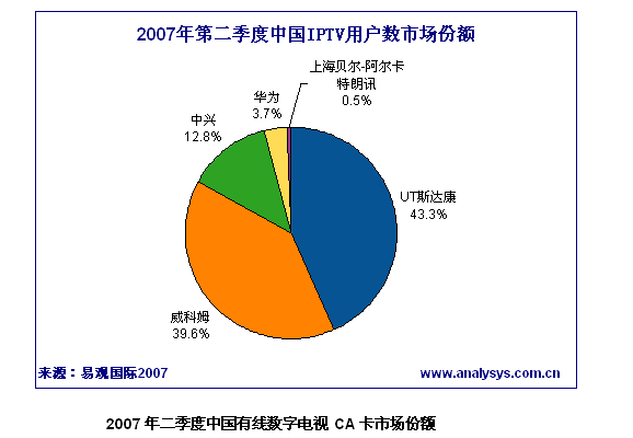 易觀國(guó)際研究表明,2007年第2季度中國(guó)IPTV用戶數(shù)達(dá)到73.6萬(wàn),根據(jù)各廠商中標(biāo)業(yè)務(wù)區(qū)實(shí)際發(fā)展的用戶數(shù)排名,UT斯達(dá)康占據(jù)第一,河南廠商威科姆占據(jù)第二,中興通訊位居第三。