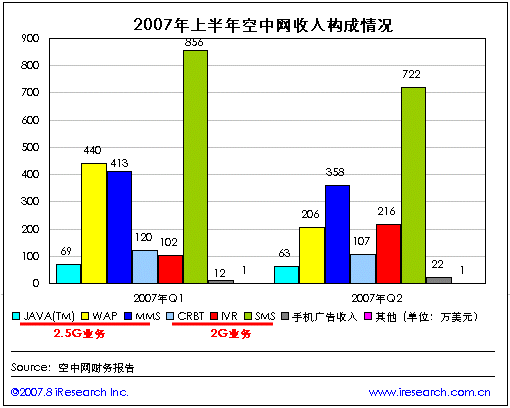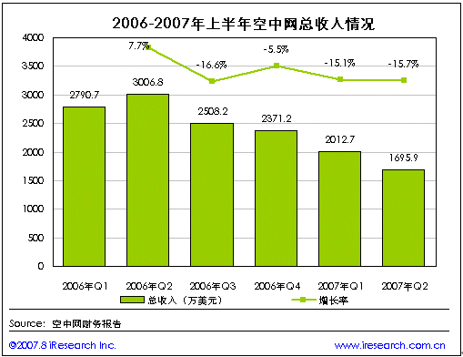 空中網(wǎng)2007年第二季度財(cái)報(bào)數(shù)據(jù)顯示,第二季度空中網(wǎng)的總收入1695.9萬(wàn)美元,同比負(fù)增長(zhǎng)43.6%,環(huán)比負(fù)增長(zhǎng)15.7%。與第一季度相比在空中網(wǎng)兩個(gè)產(chǎn)品平臺(tái)的主要2G業(yè)務(wù)和2.5G的業(yè)務(wù)收入都出現(xiàn)了不同程度的下降,但2G業(yè)務(wù)中的IVR業(yè)務(wù)收入則出現(xiàn)了大幅上升。