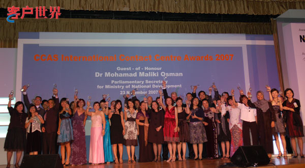 2007年11月23日,新加坡。2007年度國際呼叫中心大獎(jiǎng)?lì)C獎(jiǎng)典禮今天在新加坡Ritz Carlton酒店隆重舉行;繼2006年首度接軌亞太地區(qū)最佳呼叫中心評(píng)選活動(dòng)之后,中國呼叫中心行業(yè)協(xié)會(huì)CNCCA再次組團(tuán)出訪獅城新加坡。在本年度國際最佳呼叫中心評(píng)選的角逐當(dāng)中,來自中國的中國電信深圳分公司10000號(hào)客戶服務(wù)中心、中國移動(dòng)通信集團(tuán)廣東有限公司客戶服務(wù)(廣州)中心、中國工商銀行電子銀行中心攜手榮膺最佳呼叫中心大獎(jiǎng)。