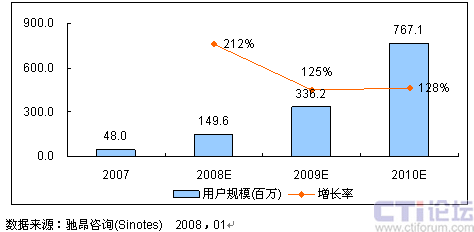 馳昂咨詢(Sinotes)發(fā)布的《2007-2008年中國(guó)3G后視頻應(yīng)用市場(chǎng)研究報(bào)告》顯示,2007年,中國(guó)視頻應(yīng)用市場(chǎng)規(guī)模為233.7億元,比2006年同期增長(zhǎng)了84%,用戶規(guī)模近4800萬(wàn),比2006年的2300萬(wàn)翻了一番。馳昂咨詢的分析師孟慶雯認(rèn)為,這主要得益于產(chǎn)業(yè)鏈各方在利用現(xiàn)有2.5G/2.75G網(wǎng)絡(luò)開(kāi)展視頻應(yīng)用服務(wù)上做的有益嘗試。產(chǎn)業(yè)鏈各方的努力加快了3G視頻應(yīng)用市場(chǎng)培育步伐,基本滿足了在現(xiàn)有網(wǎng)絡(luò)條件下用戶對(duì)視頻服務(wù)的需求,確保了由2.5G/2.75G向3G的業(yè)務(wù)銜接和過(guò)渡。
