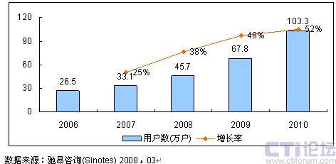 圖1 2008-2010年中國(guó)無(wú)線電郵業(yè)務(wù)用戶規(guī)模預(yù)測(cè)